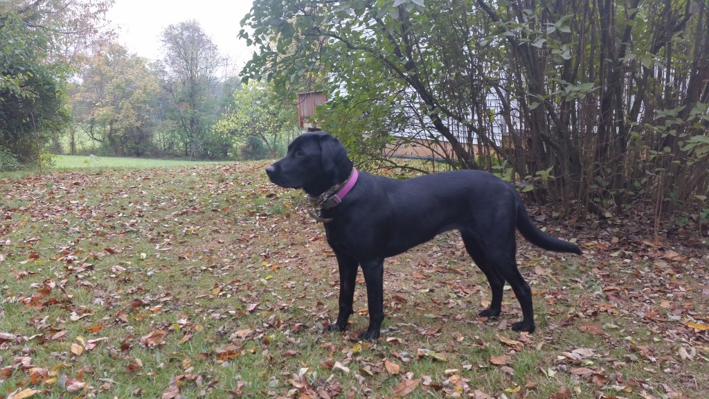 At nine months of age, Adi had her first closeup encounter. She was exploring near our driveway when we both heard the crashing of an animal through leaves. Before I could react, that squirrel was running within inches of Adi’s nose, toward the road, and up a tree. Adi was too far away to grab so I had to rely solely on words and training. She had already taken several steps in pursuit when I voiced the commands, “No! Stay!” She froze.