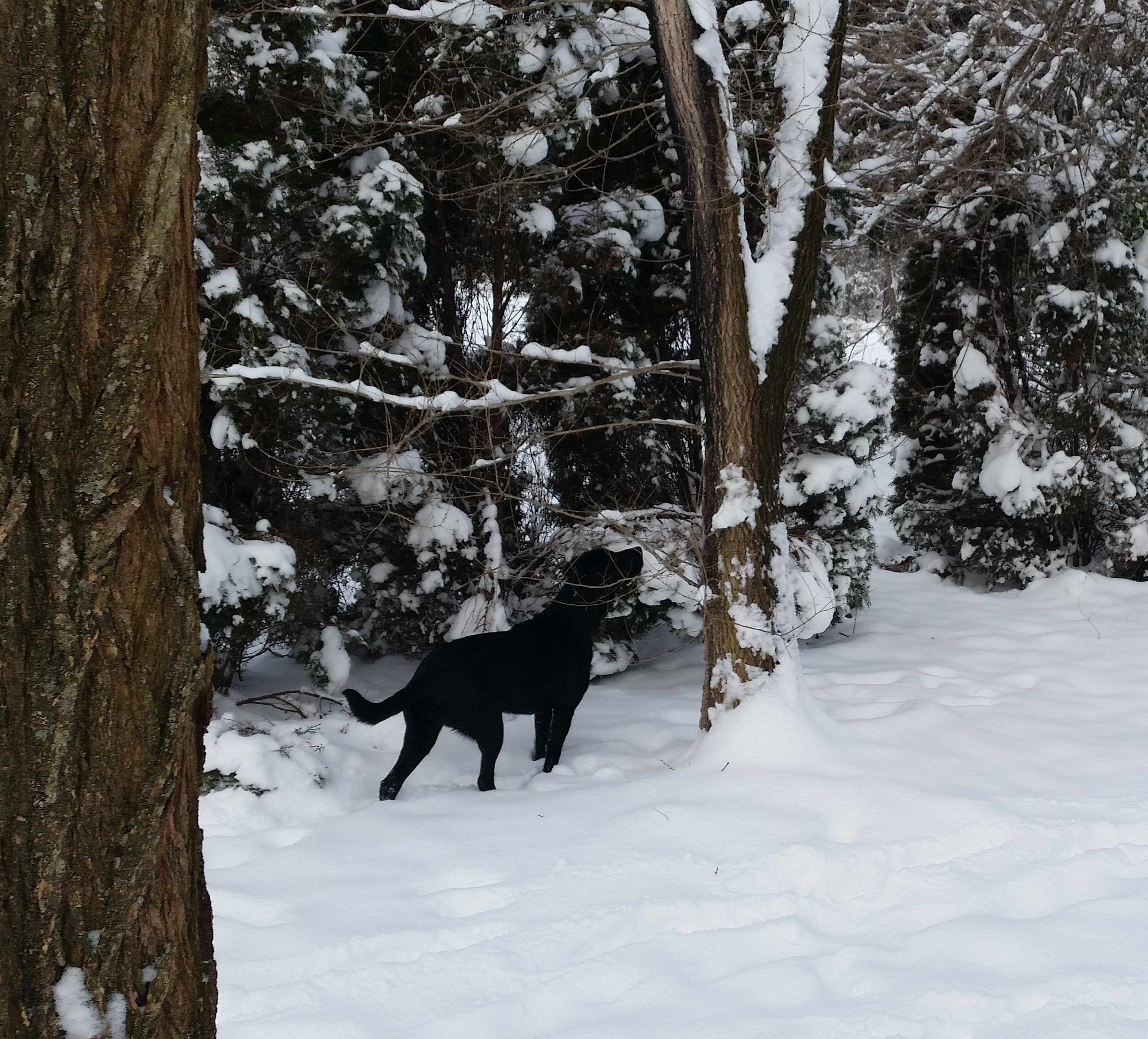 Even the squirrels seemed different. Their dark bodies easily seen against the white background were moving much slower than usual. Curiously, Adi followed one to a tree. Only this time he didn’t disappear without a trace in the abyss of the tree line. As he jumped from branch to branch, large chunks of snow came crashing down around her, making squirrel sized holes in the snow. Tentatively, she moved forward searching for what had fallen. My pup’s head went from ground to sky and back again. Her nose and eyes searching for answers and understanding.