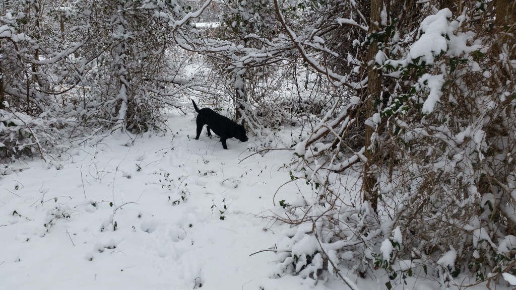 At two years of age, my southern pup had limited experience with snow. As Adi explored our property the morning after her first big winter storm, she saw the familiar coated in the unfamiliar. Her nose had to dig under seven inches of snow to find everyday smells. The wood pile that once seemed a natural part of the landscape was now a giant, white monster best avoided.