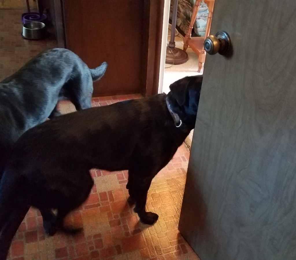 By midday, the call to retrieve a salad sent me to the basement door. I was met there by Adi’s sister Nova. This Labrador’s nose had told her a cat was in the basement. She was clearly desperate for an encounter. I looked at her large brown eyes that were pleading to follow and wondered if 365 days of love and affection from Adi were enough for Reeses to meet another dog.