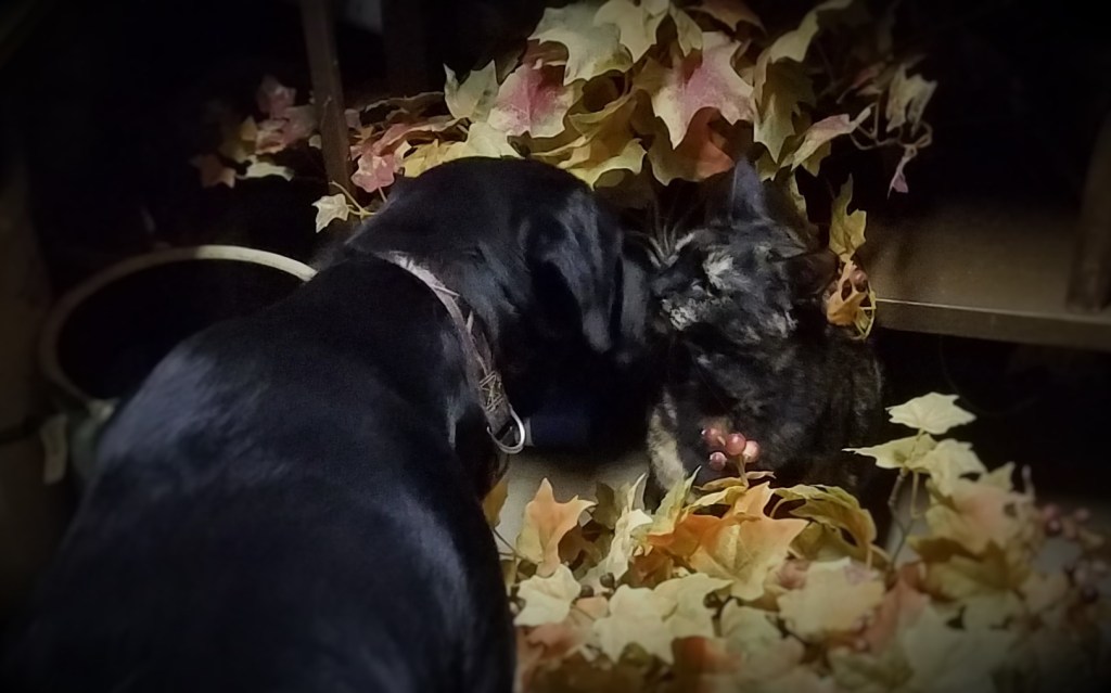 Time came for me to return the food to the basement refrigerator. Nova eagerly accompanied me on the trip. To my surprise, Reeses emerged immediately and marched right up to Nova initiating contact. Nova stood stock still as Reeses reached up and rubbed her face against Nova’s muzzle then twined herself between Nova’s front legs before turning and disappearing into the dark recesses of the basement. When Nova turned and looked at me, I knew she was completely smitten with our cat.