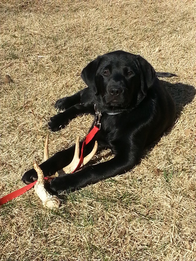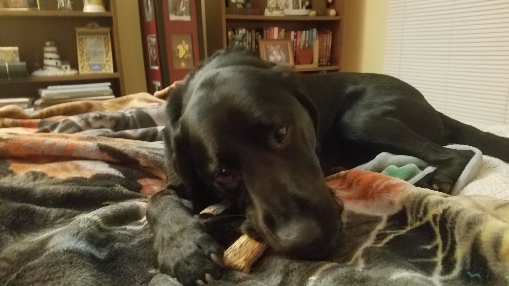 Dogs have a natural inclination to chew. Fortunately, our Lab falls into the category of moderate chewer. This means she doesn’t immediately destroy what she chews. Nor will she chew on just anything. Once Adi passed the puppy teething phase, she selected a deer antler as her chew of choice. Slow and methodical are the best ways to describe the way she chews that antler.