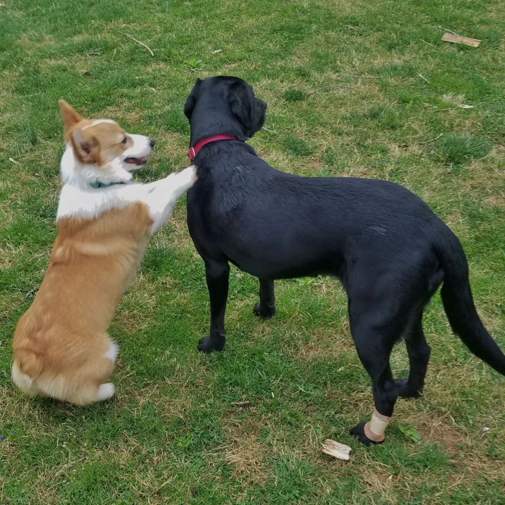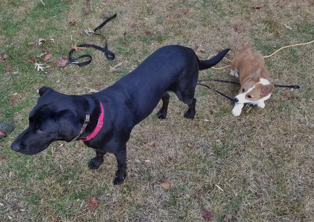 As to be expected these differences led to some misunderstandings. After all the “get to know you” sniffs were over, Adi got a rope toy and offered it to Gwenny, the puppy. The Corgi sniffed the toy then raced around to Adi’s hind end. She proceeded to make every effort to herd Adi in the direction she wanted. Adi responded by wheeling around and giving the play bow in hopes of engaging her in a game of Labrador chase. Gwenny ignored this Labby invitation and raced behind Adi again. Thinking she wasn’t interested in playing, Adi abandoned Gwenny and came over to hang out with the humans. With nothing to herd, the Corgi wandered off to explore the yard with her nose.