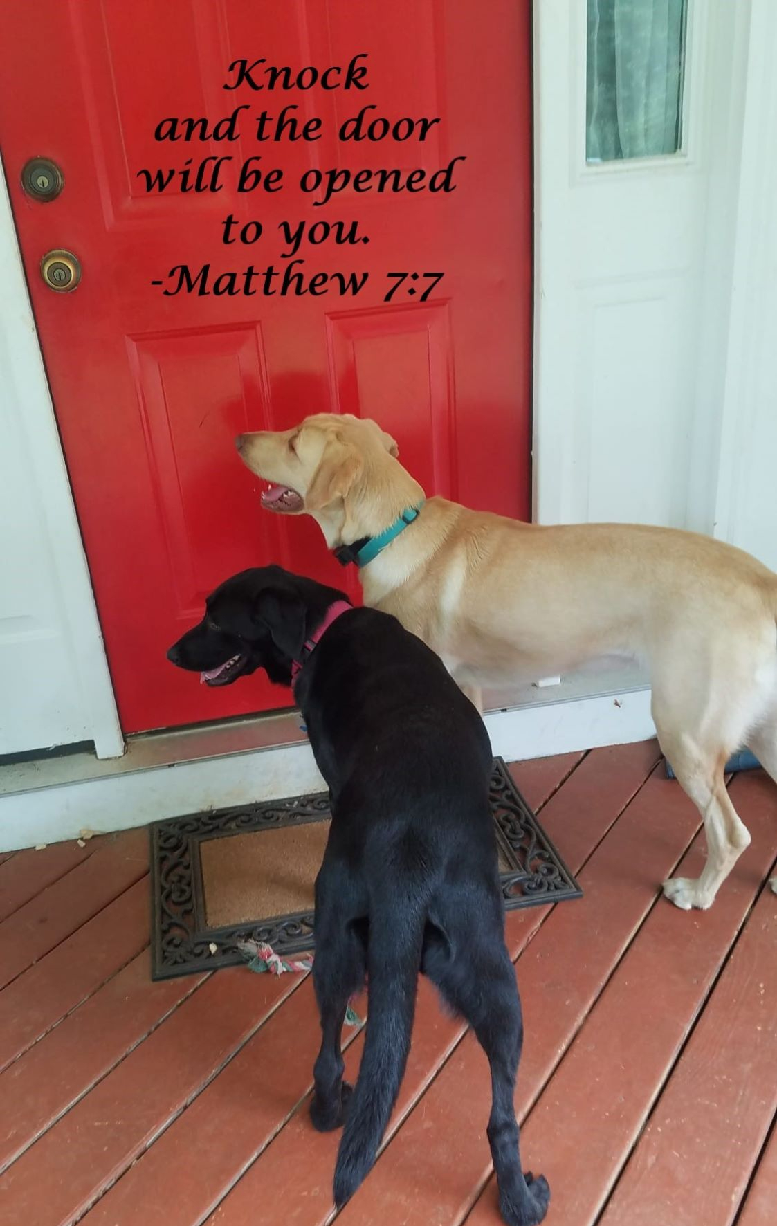 Right now for my personal Bible study, I am working my way through Jesus’ “Sermon on the Mount.” This past week found me in the 7th chapter of Matthew. As I studied the passage titled “Ask, Seek, Knock” the pictures featured above kept flitting through my mind as an illustration of the text. Although each picture features a different dog, these Labradors all have one thing in common. Their calm, unwavering approach. They have given me a visual reminder to approach the Lord without hesitation and with the serenity of knowing He hears, He sees, He responds.