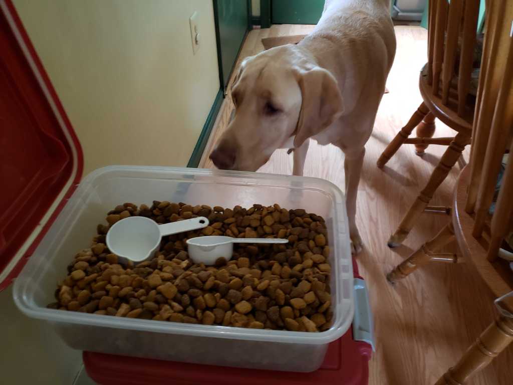When my teenager finally woke up later that morning, I got the rest of the story. She had gone upstairs to bed only to realize that Summer hadn’t followed. When she went to investigate, she found Summer with her head in Adi’s food bin noshing away gleefully. Ever the opportunist, Summer had found the bin unsecured and helped herself to a midnight snack. My daughter promptly grabbed her collar and marched her upstairs to bed.